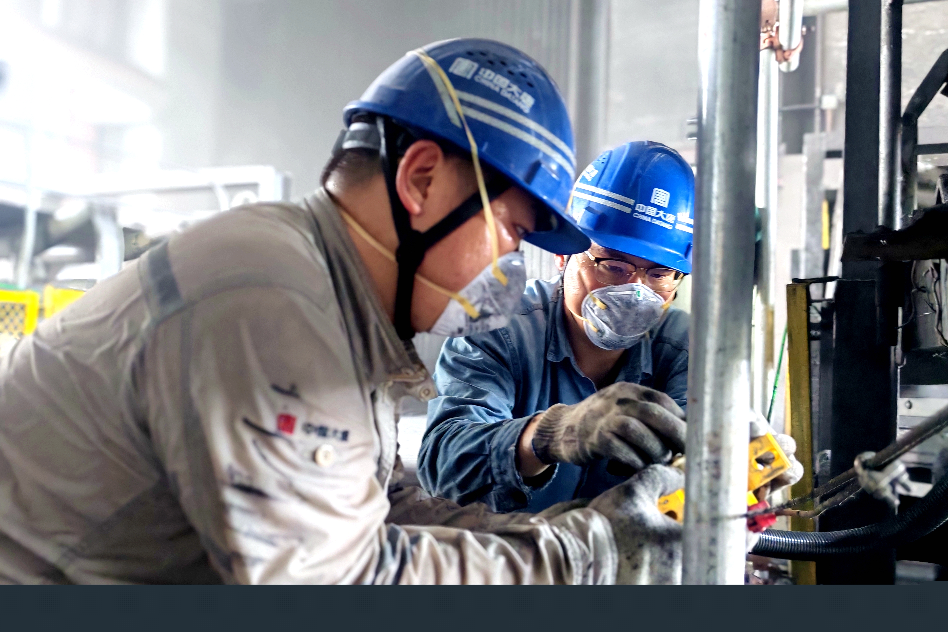 筒倉底部悶熱異常,輔控班全員早已汗流浹背。張海峰熟練地操作角磨機,拆除舊電纜,防護服上沾滿了粉塵;未紀牢一趟趟扛著沉重的鍍鋅管在狹窄空間里穿梭,工裝后背凝結出鹽霜;關興昆鉆入低矮的皮帶架下,用沖擊鉆打孔、固定管卡,任憑汗水從臉頰滑落。