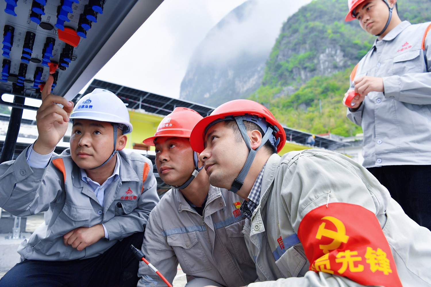 駐村工作隊與施工單位人員正在查看光伏板安全情況