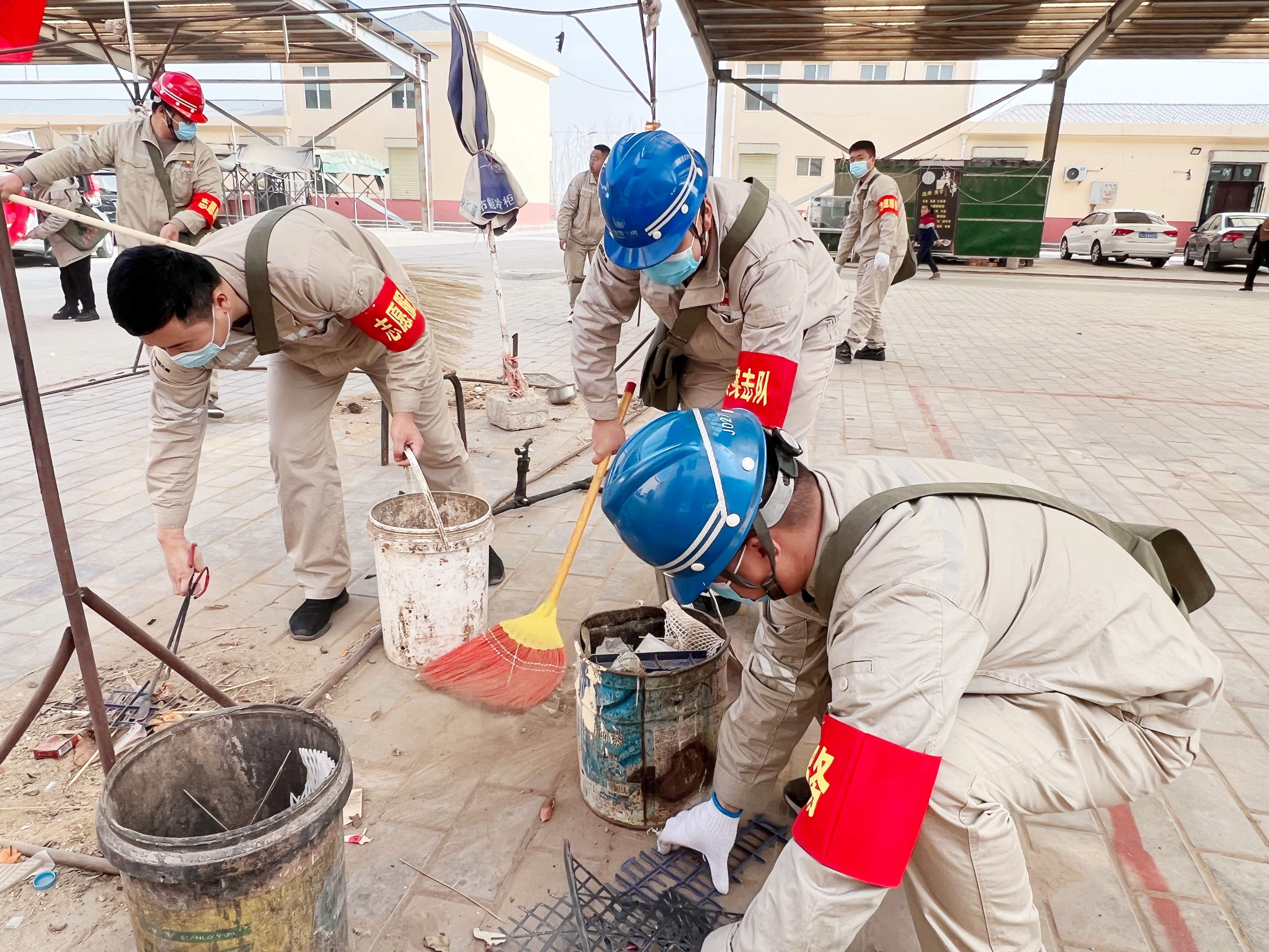 志愿者認(rèn)真細(xì)致地清掃晉江商貿(mào)市場(chǎng)積存的雜物、碎磚瓦礫
