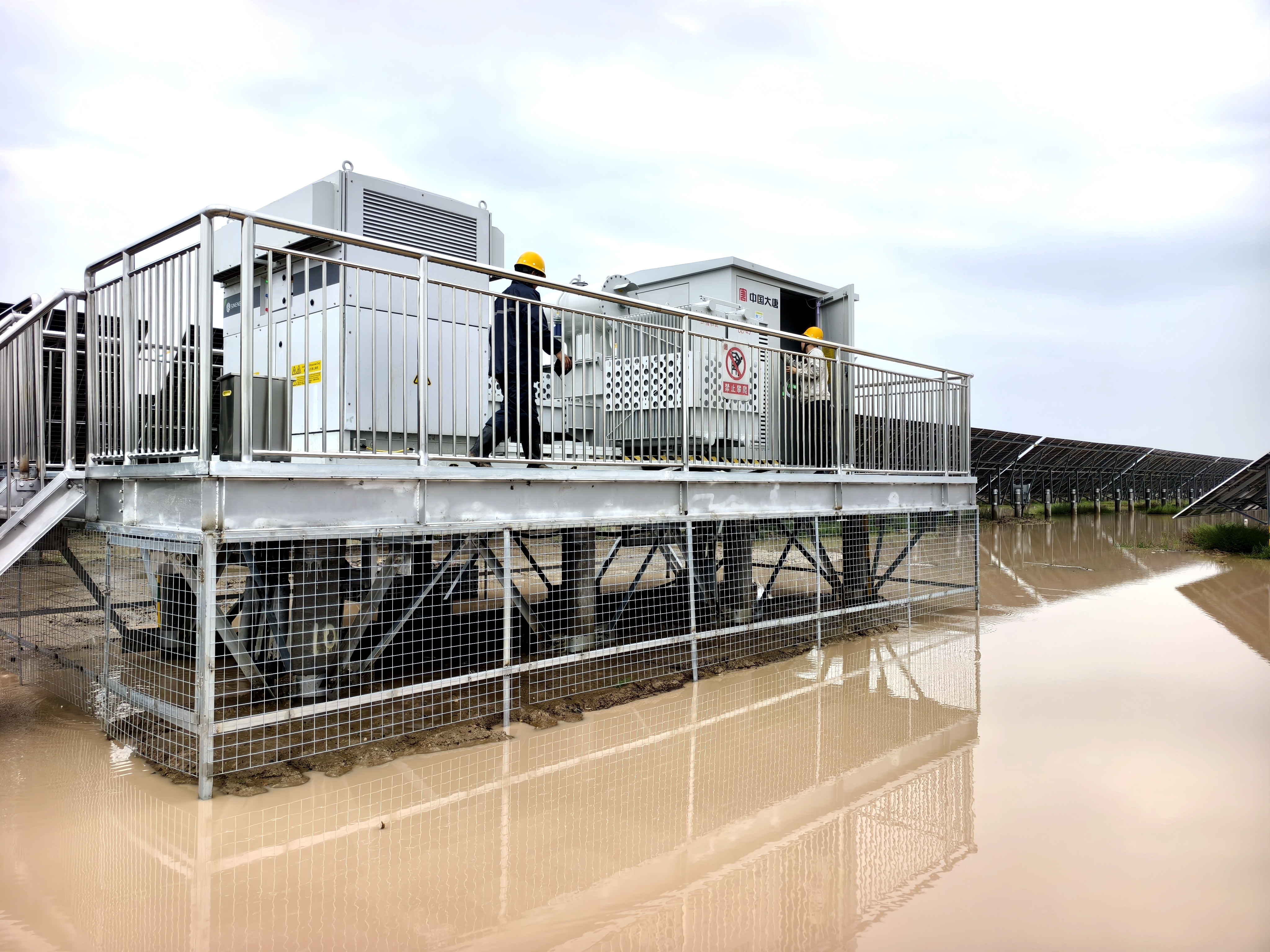 運(yùn)行人員是沖鋒在前的第一道防線。他們迅速穿戴好雨衣、雨褲和救生衣?!敖?、明瑞,跟我去二標(biāo)段!苗苗、德山去一標(biāo)段,瑞平和小徐去三標(biāo),大家注意現(xiàn)場涉水安全,水深泥滑,兩人一組,互相照應(yīng)!”班長李龍大聲叮囑。在泥濘的光伏陣列區(qū),積水最深處已沒過人大腿,他們深一腳淺一腳艱難跋涉。面對2米深的積水區(qū)域,三人筏板小組迅速成立?!皠?dòng)作穩(wěn),斷電操作按規(guī)程來,安全第一!”李瑞平一邊操作一邊提醒。對講機(jī)里不時(shí)響起各組的匯報(bào):“一標(biāo)段1號方陣1-12號匯流箱隔離完成!”“二標(biāo)段高風(fēng)險(xiǎn)點(diǎn)已斷電!”