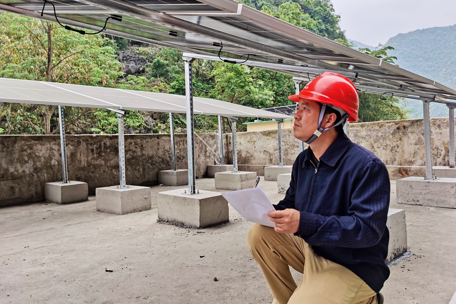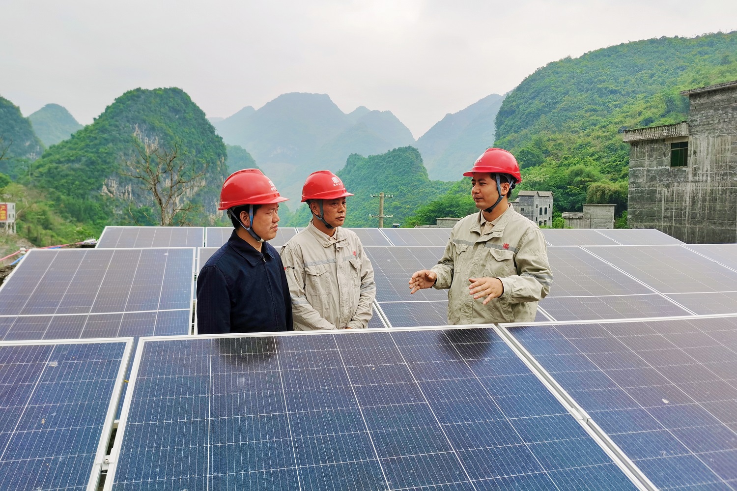 駐村工作隊與施工單位人員正在查看光伏板安全情況