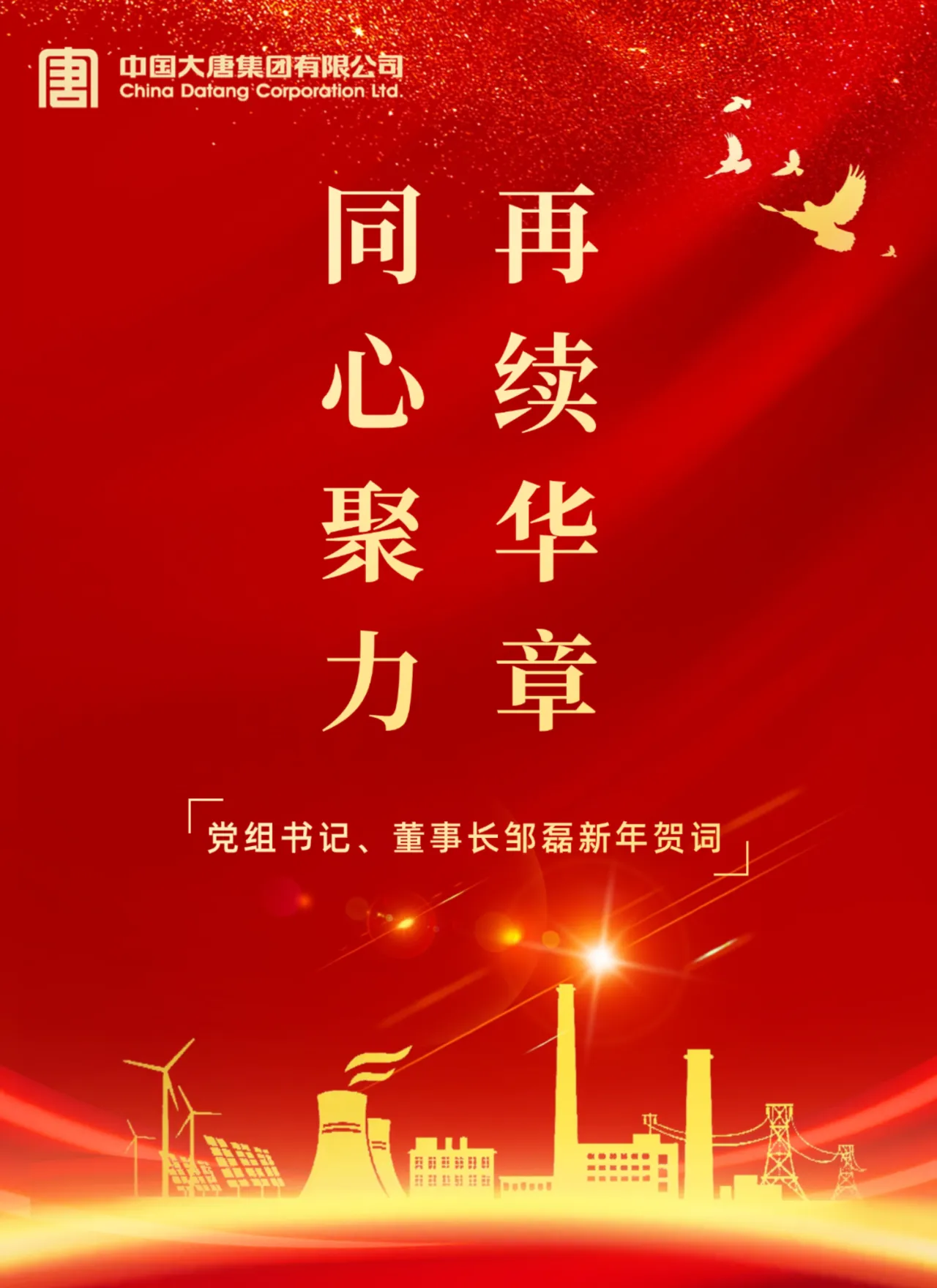 值此辭舊迎新之際,謹(jǐn)向長期以來關(guān)心支持中國大唐集團(tuán)有限公司工作的各級領(lǐng)導(dǎo)、各界朋友、合作伙伴,向始終心系集團(tuán)公司改革發(fā)展的離退休老領(lǐng)導(dǎo)、老同志,向奮戰(zhàn)在各條戰(zhàn)線的廣大干部職工和家屬,致以誠摯的問候和美好的祝愿!